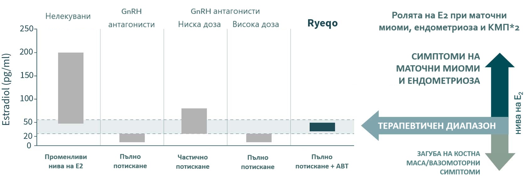 RYEQO® е показан за симптоматично лечение на ендометриоза при жени в репродуктивна възраст с анамнеза за предшестващо лекарствено или хирургично лечение на ендометриоза