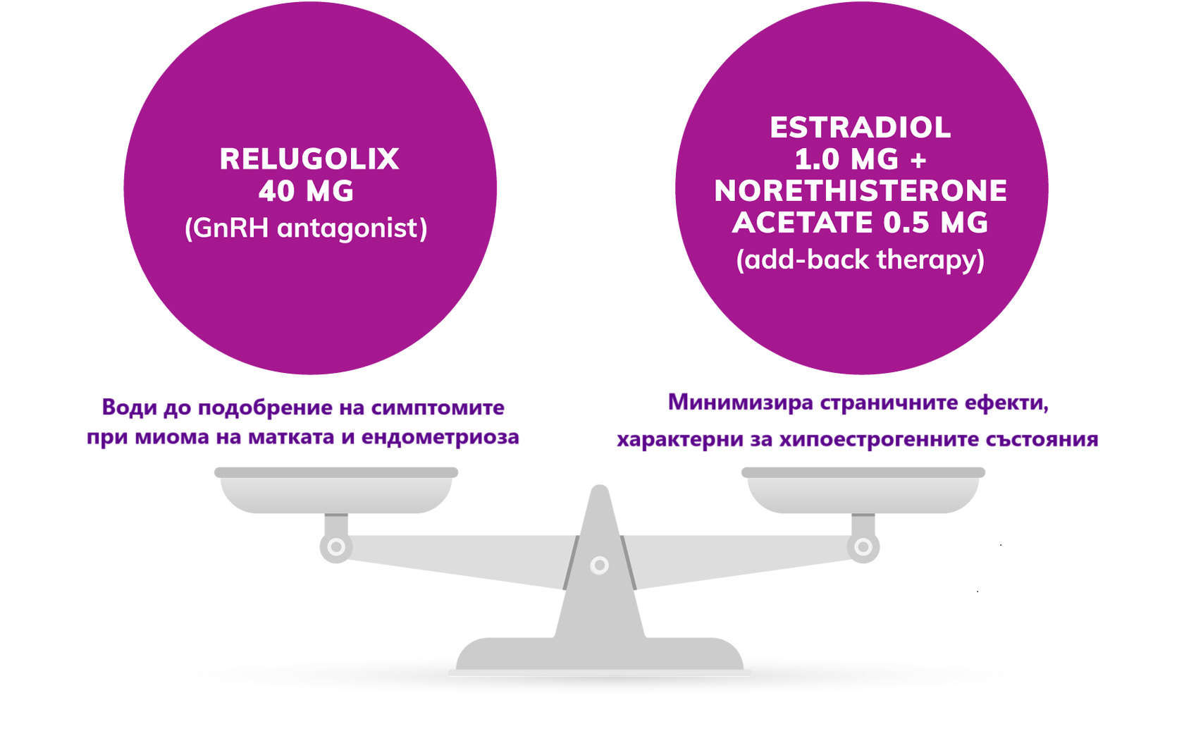 Relugolix води до подобрения на симптомите при маточни миоми и ендометриоза, докато добавената (add-back) терапия минимизира ефектите, типични за хипоестрогенни състояния, осигурявайки правилния баланс между ефикасност и безопасност.2–7